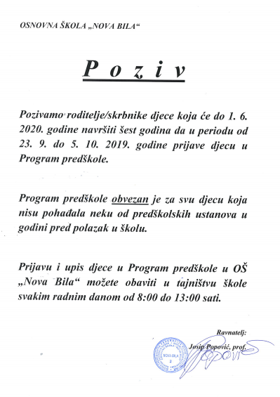 1. Nastavnik hrvatskog jezika 4 sata tjedno, 1 izvršitelj na određeno radno vrijeme do 30.6.2020. godine, mjesto obavljanja rada OŠ “Nova Bila“